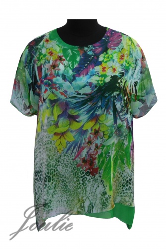 Двухслойная туника из шифона расклешенного силуэта, со спущенным плечом. Нижний слой в виде майки - однотонный, верхний с принтом.