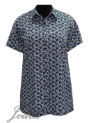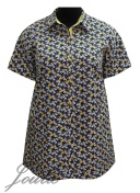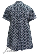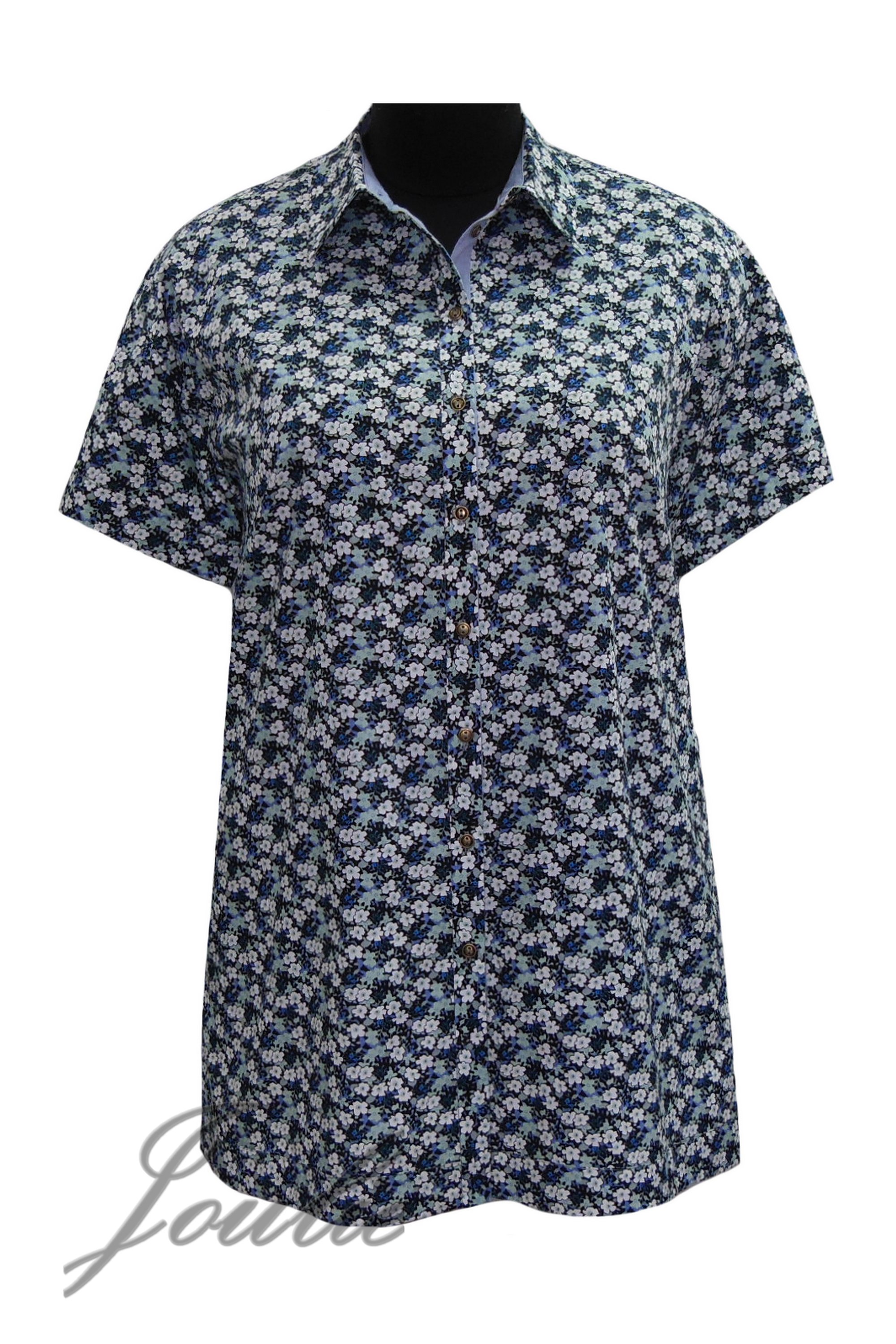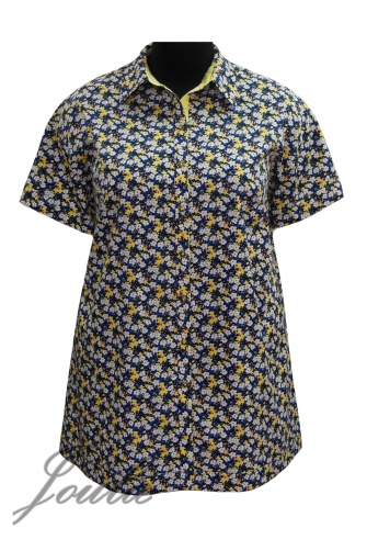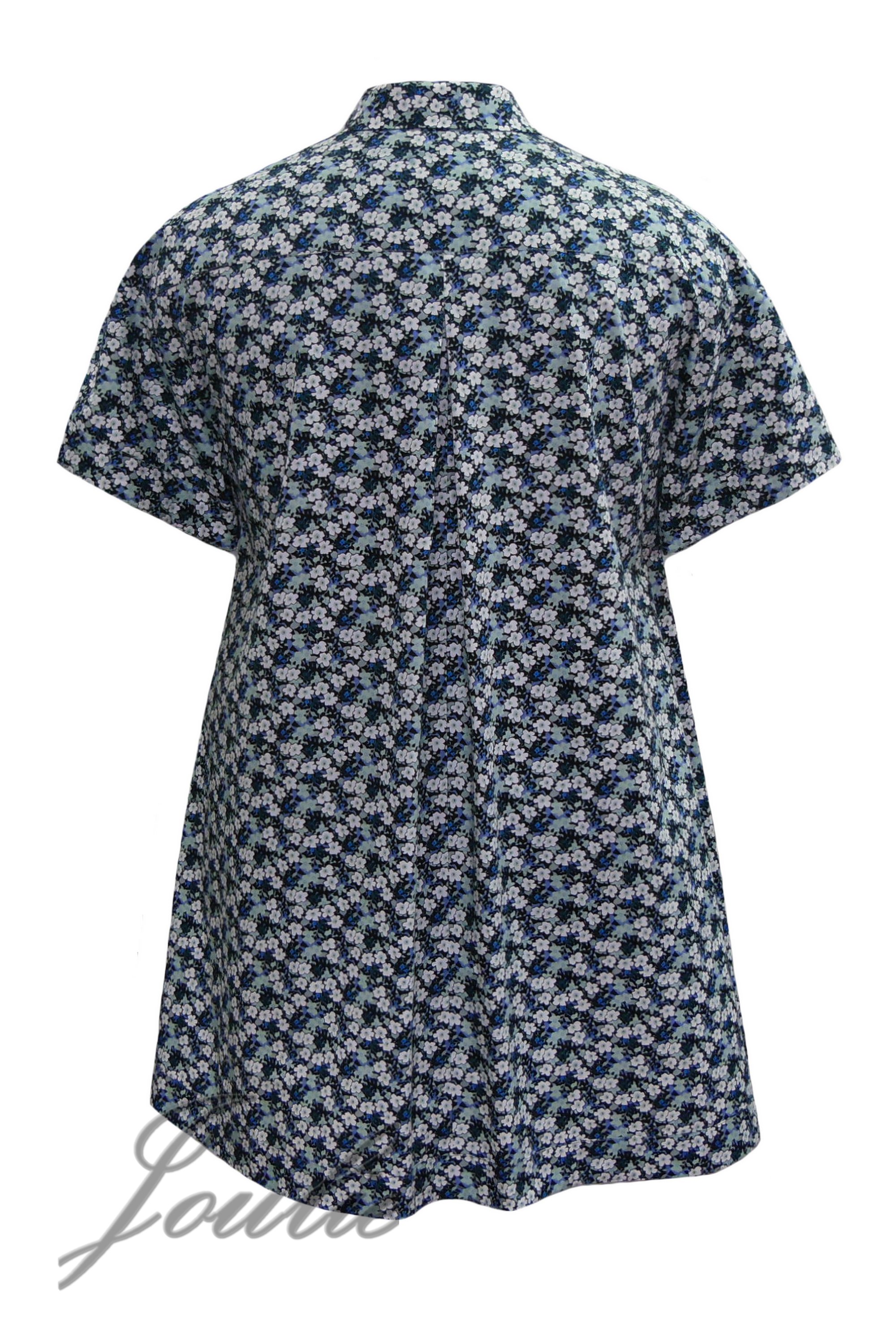 Туника-рубашка свободного силуэта из ткани. Рукав короткий. Воротник отложной со стойкой. Застежка на пуговицы.